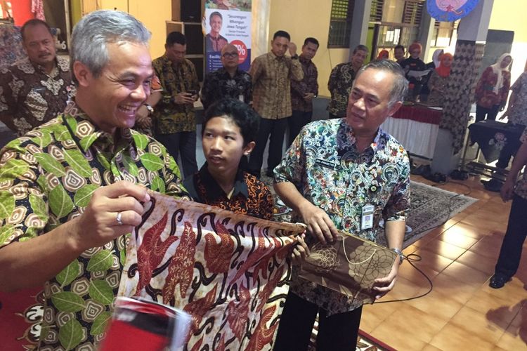 Gubernur Jawa Tengah Ganjar Pranowo mengamati kain batik pada peringatan Hari Batik di Banyumas, Senin (2/10/2017). Ganjar mengaku sering mempromosikan batik Jawa Tengah ke berbagai kegiatan dengan mengenakan batik dan memamerkannya.(DAVID OLIVER PURBA/ KOMPAS.com)