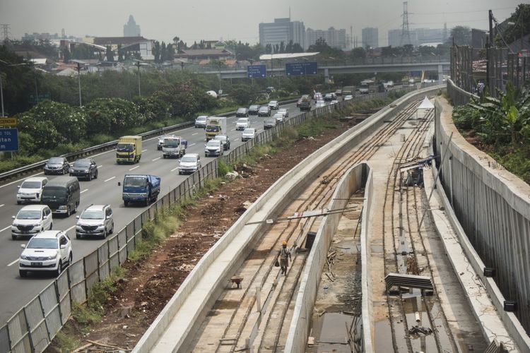 Kendaraan melintas di samping proyek pembangunan kereta ringan atau Light Rail Transit (LRT) rute Cibubur-Cawang di Tol Jagorawi, Cibubur, Jakarta, Kamis (10/8/2017). Pengerjaan proyek pembangunan LRT Jabodetabek yang meliputi tiga rute, yaitu rute Cibubur-Cawang sepanjang 14,5 km telah mencapai 37 persen, rute Bekasi Timur-Cawang sepanjang 17,1 km telah mencapai 17 persen sementara rute Cawang-Dukuh Atas sepanjang 10,5 km baru mencapai tiga persen. ANTARA FOTO/Aprillio Akbar/aww/17.(ANTARA FOTO/Aprillio Akbar)