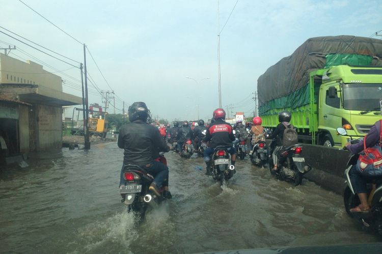 Sejak Senin (2/10/2017) lalu, air menggenang di jalan pantura Kota Semarang akibat curah hujan tinggi.
