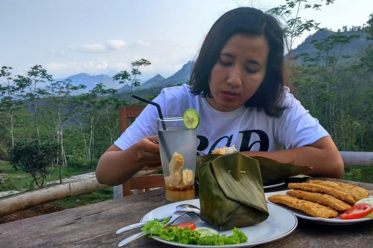 Seorang wisatawan tengah menikmati nasi gegog, kuliner khas Trenggalek. Sentra nasi gegog terletak di Kecamatan Bendungan, Kabupaten Trenggalek, Jawa Timur.(KOMPAS.com/ SLAMET WIDODO)
