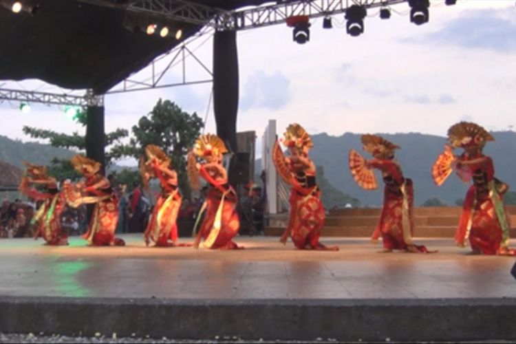 Penari membawakan karya Guruh Soekarnoputra dalam pembukaan Festival Kesenian Kawasan Selatan (FKKS) di panggung 360 Pantai Prigi, Trenggalek (21/10/2017).