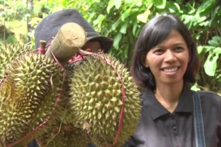 Wisatawan bersama petani durian di desa wisata Sawahan, Kecamatan Watulimo, Kabupaten Trenggalek, Jawa Timur.
