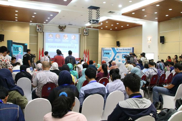 Diskusi media Forum Merdeka Barat 9 (FMB9) bertema Kontroversi Registrasi SIM Card: Nyaman, Aman, dan Menguntungkan Siapa? di Ruang Roeslan Abdoelgani, kantor Kementerian Kominfo, Selasa (7/11/2017).