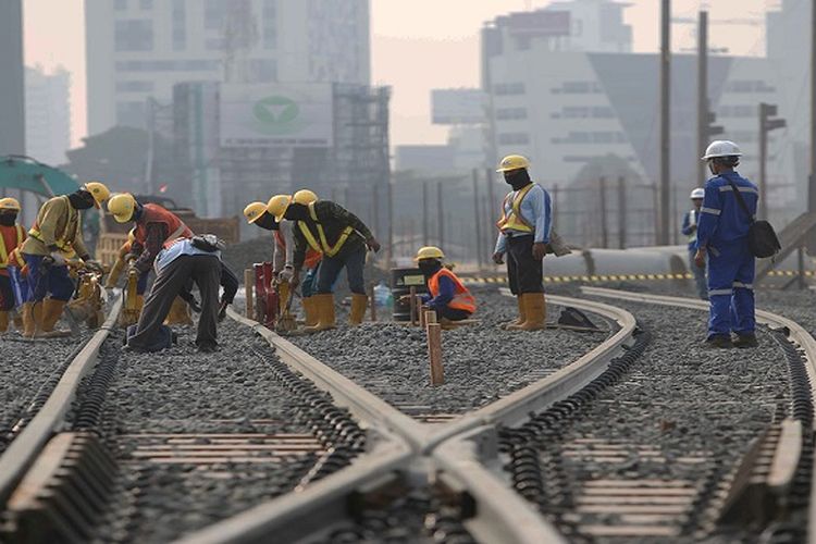 Aktivitas pekerjai menyelesaikan pembangunan Stasiun Depo angkutan massal cepat (Mass Rapid Transit/MRT) Lebak Bulus, Jakarta, Senin (14/8/2017).Pengerjaan proyek MRT fase pertama ini diperkirakan rampung pada tahun 2019.