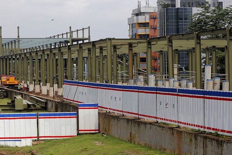 Pekerja menyelesaikan proyek pembangunan Stasiun Sudirman Baru di Jakarta, Senin (6/3/2017). Stasiun yang terintergrasi dengan stasiun MRT itu hanya akan melayani penumpang dari Stasiun Manggarai menuju bandara Soekarno Hatta melewati Stasiun Sudirman Baru, Duri, dan Batu Ceper sebagai stasiun pemberhentian dan diperkirakan selesai pada tahun 2017.(KOMPAS.com / GARRY ANDREW LOTULU)