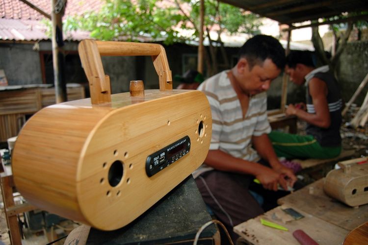 Pengrajin menyelesaikan pembuatan radio berbahan bambu di Galeri Bambootronic di Jalan Rante, Kelurahan Gunung Batu, Kecamatan Bogor Barat, Kota Bogor, Kamis (5/11/2015). Galeri Bambootronic juga membuat Kerajinan jam gravitasi yang dibanderol dengan harga Rp 5 juta sampai Rp 15 juta dan sudah dipasarkan sampai ke mancanegara.(KOMPAS.com / RAMDHAN TRIYADI BEMPAH)