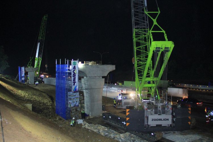 Proses pemasangan steel box girder proyek Jalan Tol Jakarta Cikampek II (Elevated), Selasa (7/11/2017) dini hari.