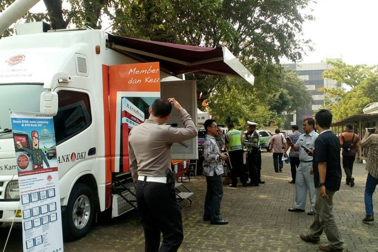 Posko pembayaranPajak Kendaraan Bermotor (PKB) dan Bea Balik Nama Kendaraan Bermotor (BBNKB) dalam razia pajak yang digelar di depan gedung Samsat Jakarta Barat, Jumat (11/8/2017).