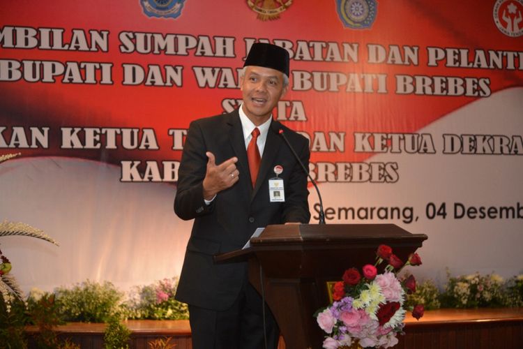 Gubernur Jateng Ganjar Pranowo memberikan sambutan dalam acara pelantikan Bupati Brebes, belum lama ini. Ganjar akan menemui presiden untuk memperjuangkan nasib ribuan GTT di Provinsi Jateng. (Kompas.com/Andi Kaprabowo)