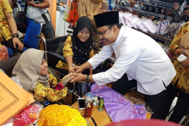 Gus Ipul menyalami ibu yang duduk di kursi roda usai menghadiri talkshow Hari Ibu di Grand City, Surabaya, Kamis (21/12/2017). (Kompas.com/Achmad Faizal)