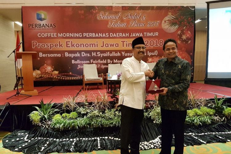 Gus Ipul saat menjadi pembicara dalam Coffee Morning Perhimpunan Bank Nasional (Perbanas) Daerah Jatim dengan tema Prospek Ekonomi Jatim 2018 di Surabaya, Rabu (17/1/2018)