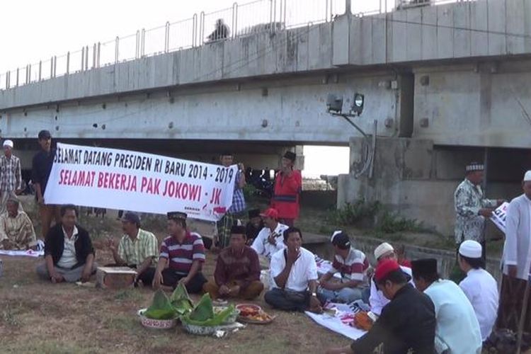 Relawan Jokowi-JK yang tergabung dalam Seknas menggelar doa bersama dan larung sesaji di kaki Jembatan Suramadu, Senin (20/10/2014).