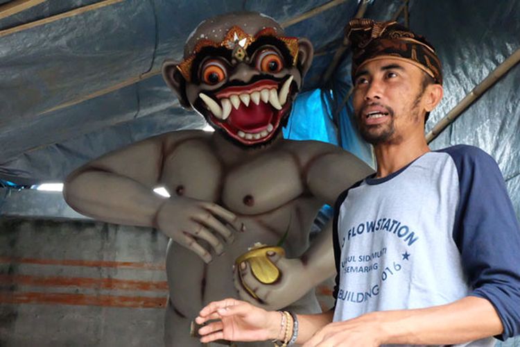I Kethut Suadana, Kreator Cerita Amerih Tirta, menunjukkan persiapan timnya mendandani ogoh-ogoh yang akan ditampilkan di Ancol Festival Ogoh-ogoh di Pura Dharma Sidhi, Ciledug, Tangerang, Selasa (13/3/2018).