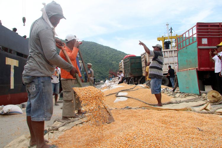 Sejumlah pekerja di pelabuhan Gorontalo menyiapkan jagung yang akan diekspor ke Filipina, Jumat (4/5/2018).(KOMPAS.COM/ROSYID AZHAR)
