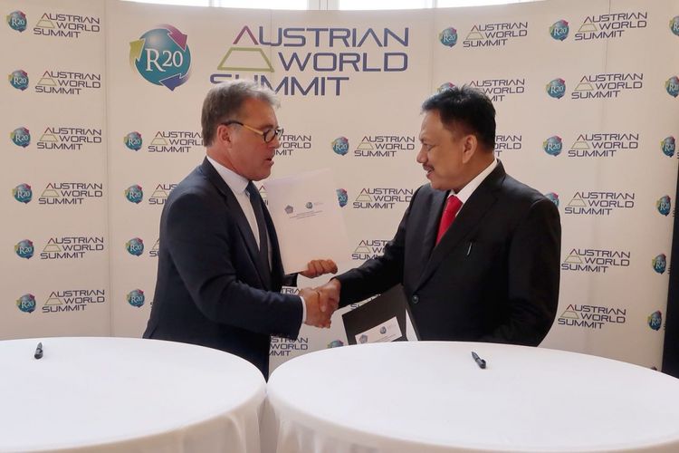 Gubernur Sulawesi Utara, Olly Dondokambey, dan Direktur Eksekutif Regions20 Asia-Pacific, Christopher Nuttall, menandatangani nota kesepahaman tentang pengelolaan sampah di Kota Wina, Austria, Selasa (15/5/2018) malam