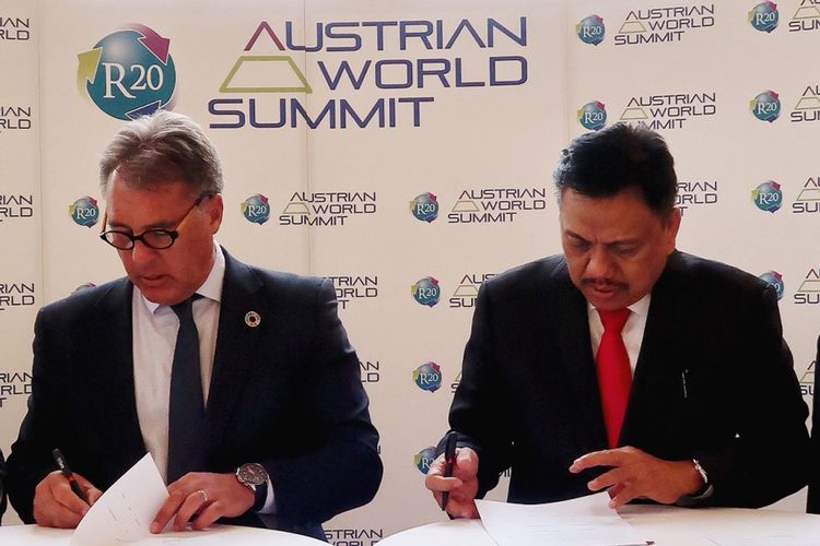 Gubernur Sulawesi Utara, Olly Dondokambey, dan Direktur Eksekutif Regions20 Asia-Pacific, Christopher Nuttall, menandatangani nota kesepahaman tentang pengelolaan sampah di Kota Wina, Austria, Selasa (15/5/2018) malam