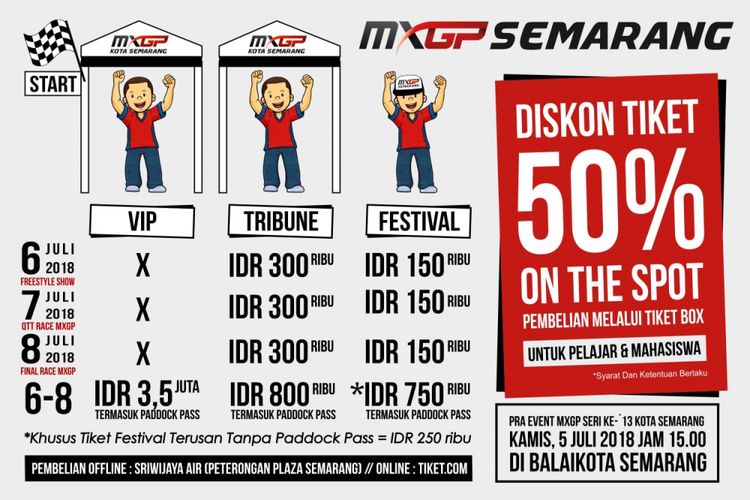 Pelajar dan mahasiswa bisa membeli tiket MXGP seri ke-13 di Kota Semarang dengan harga diskon di tiket box saat acara digelar pada 6 hingga 8 Juli 2018.