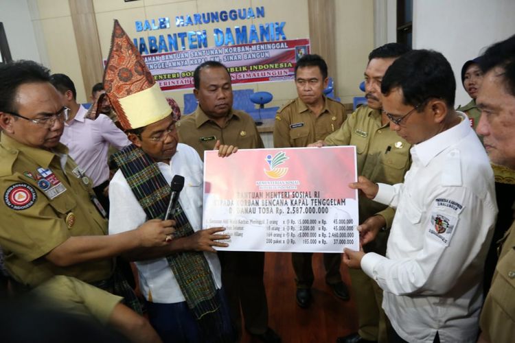 Menteri Sosial Idrus Marham menyampaikan bantuan sosial bagi korban KM Sinar Bangun, Senin (9/7/2018)