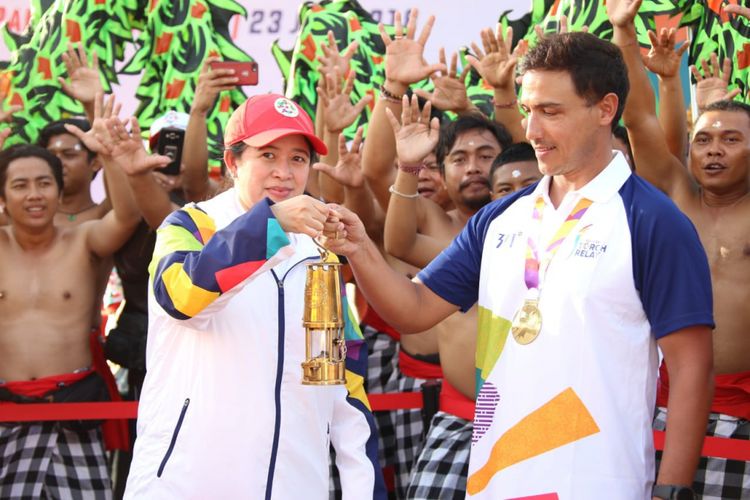 Menko Puan Maharani menerima api Asian Games dari Hamish Daud di Bali, Senin (23/7/2018)