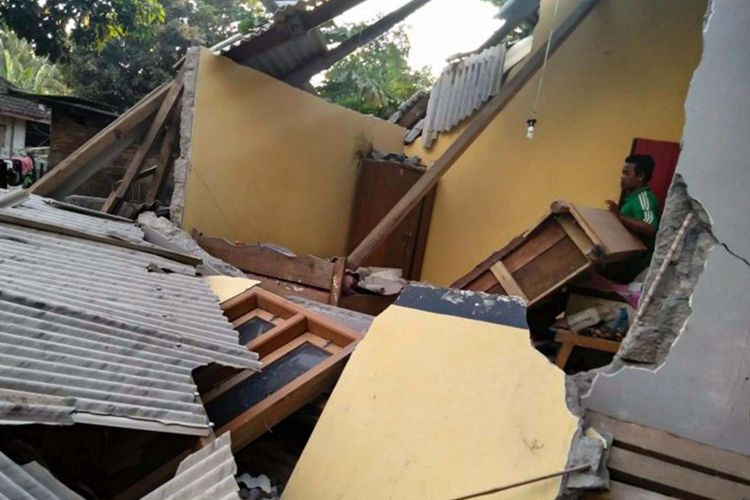 Warga di sekitar reruntuhan bangunan rumah yang rubuh akibat gempa di Lombok, NTB, Minggu (29/7/2018). Berdasarkan informasi dari Badan Meteorologi Klimatologi dan Geofisika (BMKG) gempa pertama kali mengguncang Lombok Timur dengan kekuatan 6,4 skala Richter (SR) pada pukul 06.47 Wita.(HANDOUT/BPBD NTB/AFP)