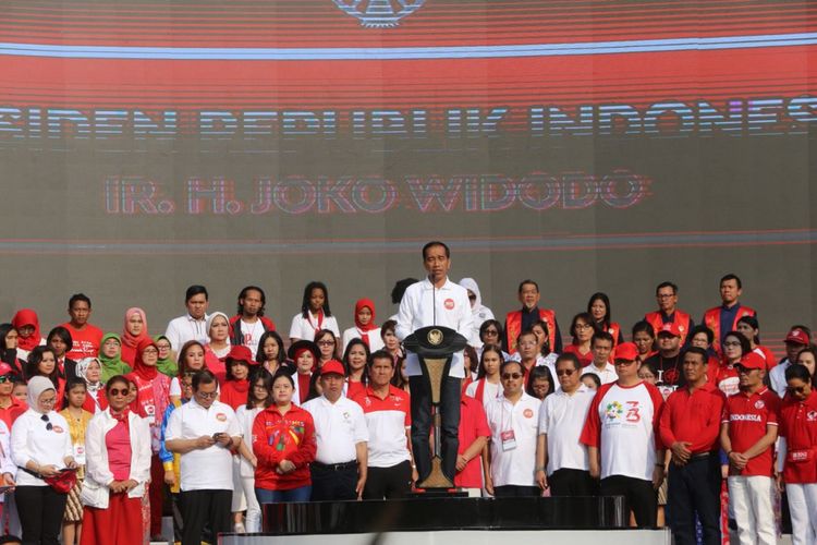 Menteri Koordinator Bidang Pembangunan Manusia dan Kebudayaan (Menko PMK) Puan Maharani mendampingi Presiden Joko Widodo menghadiri acara Harmoni Indonesia 2018, di Plaza Timur Gelora Bung Karno, Minggu (5/8/2018)