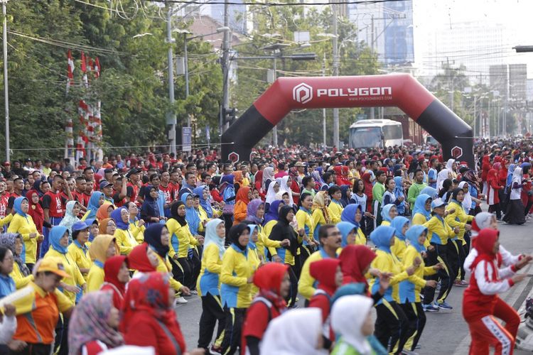 Ribuan masyarakat Kota Semarang mengikuti senam poco-poco di halaman Balai Kota Semarang, Minggu (5/8/2018).