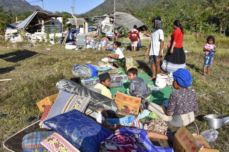 Sejumlah warga berada di halaman rumahnya pascagempa di Desa Bentek, Kecamatan Pemenang, Tanjung, Lombok Utara, NTB, Senin (6/8/2018). Gempa bumi bermagnitudo 7 mengguncang Lombok, Minggu (5/8/2018) malam.