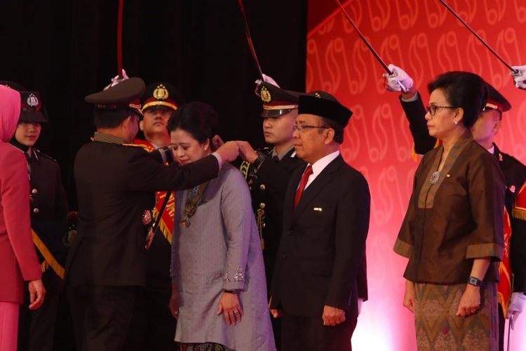 Menteri Koordinator Bidang Pembangunan Manusia dan Kebudayaan (Menko PMK) Puan Maharani menerima tanda kehormatan Bintang Bhayangkara Utama dari Presiden Republik Indonesia Joko Widodo yang diserahkan Kapolri Jenderal Polisi Tito Karnavian, Selasa (7/8/2018)(Dok. Humas Kemenko PMK)