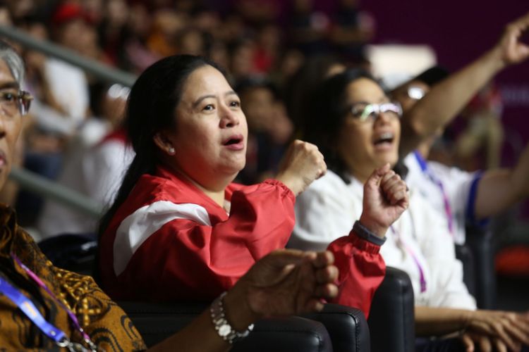 Menko PMK Puan Maharani saat menonton Timnas Basket Putera Indonesia bertanding melawan Tim Korea Selatan, di Hall Basket Komplek GBK, Senayan, Jakarta, Selasa (15/8/2018) malam.