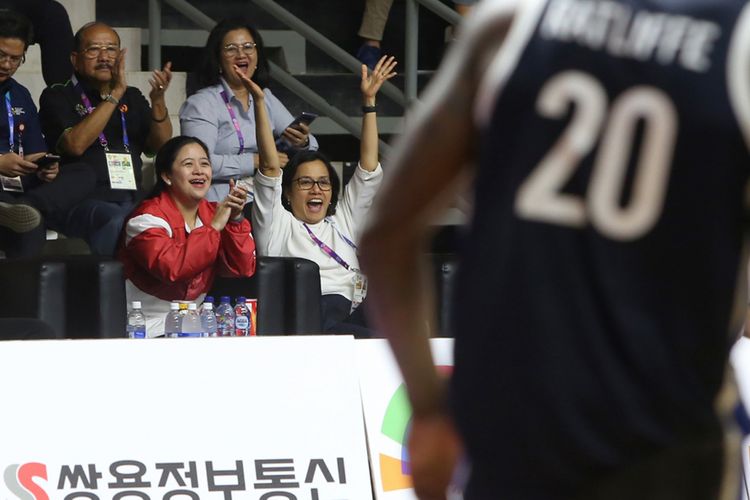 Menko PMK Puan Maharani dan Menkeu Sri Mulyani saat menyaksikan pertandingan Timnas Basket Putera Indonesia melawan Tim Korea Selatan, di Hall Basket Komplek GBK, Senayan, Jakarta, Selasa (14/8/2018) malam.