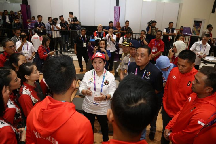 Menko PMK Puan Maharani memberikan semangat ke Tim Bowling Indonesia di Jakabaring, Palembang, Selasa (21/8/2018).