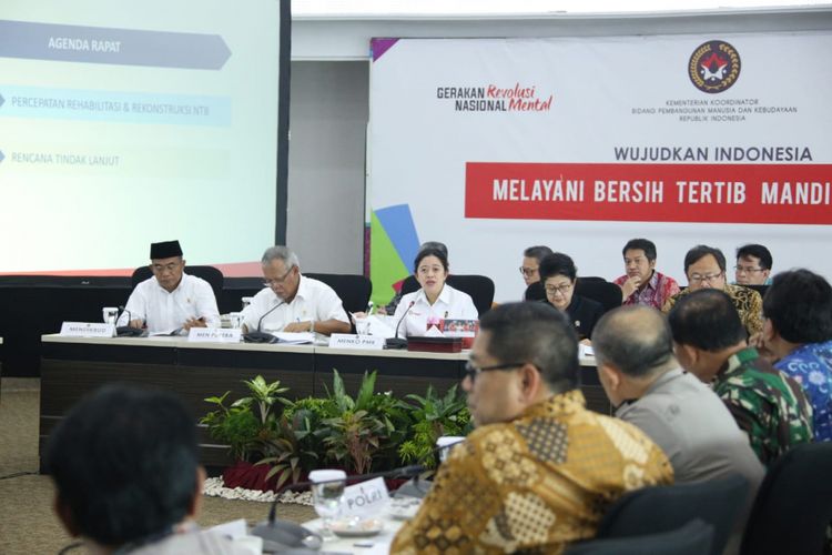 Menko PMK Puan Maharani mengadakan Rapat Tingkat Menteri (RTM) untuk membahas percepatan rehabilitasi dan rekonstruksi pasca gempa bumi di NTB, Jumat (31/08/2018)
