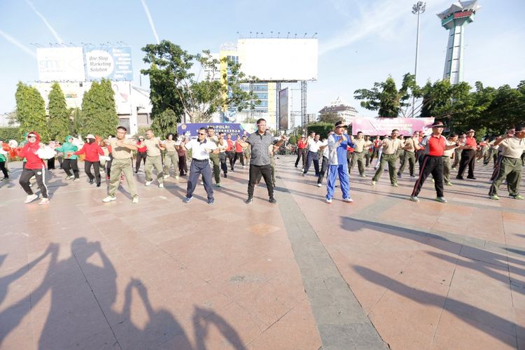 Wali Kota Semarang Hendrar Prihadi menari Gemu Famire bersama anggota TNI dalam rangka memperingati HUT TNI ke-73 di Lapangan Simpang Lima, Semarang, Selasa (4/9/2018).