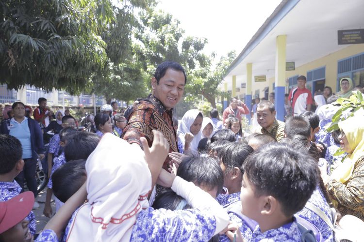 Siswa-siswi SD Pendrikan Lor 02 berebut bersalaman dengan Wali Kota Semarang Hendrar Prihadi. Wali Kota Semarang datang ke sana dalam rangka sidak mengecek kondisi infrastruktur sekolah.
