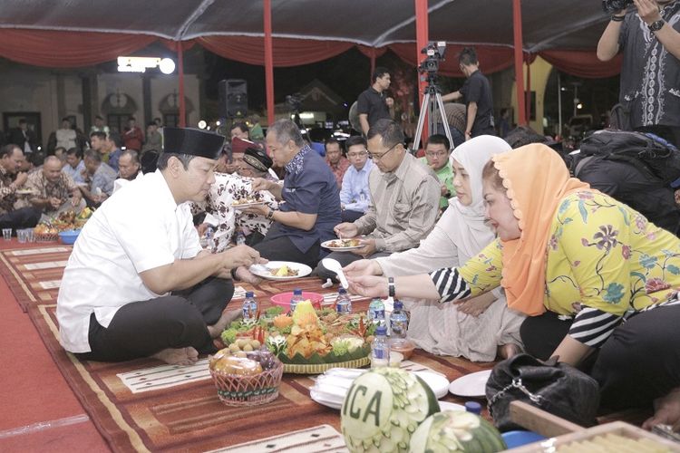 Wali Kota Semarang Hendrar Prihadi memakan nasi tumpeng Kembul Bujono dalam acara peringatan 1 Muharam atau Tahun Baru Islam di Balaikota Semarang, Senin (10/9/2018) malam.