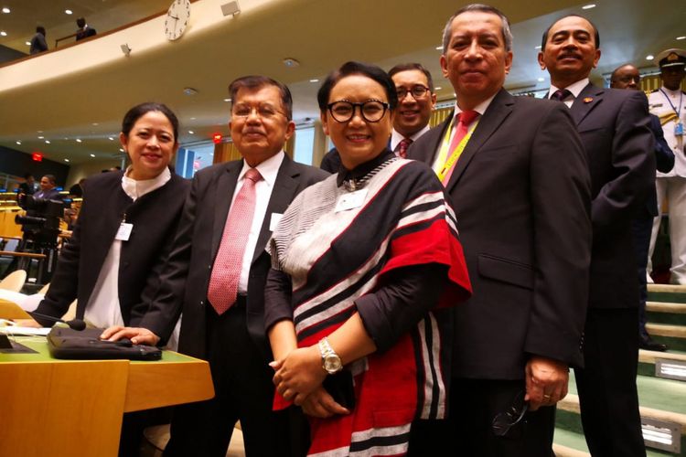 Menko PMK Puan Maharani bersama delegasi Republik Indonesia lainnya, Wakil Presiden Jusuf Kalla dan Menteri Luar Negeri Retno Marsudi dalam High Level Meeting on Global Peace di Markas Besar PBB di New York, Senin, 24 September 2018.(Dok. Kemenko PMK)