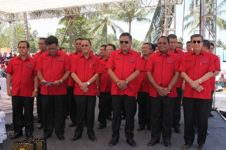 Menkumham Yasonna Laoly (Kiri) dan Gubernur Sulawesi Utara Olly Dondokambey (tiga dari kiri) dalam acara pelantikan Ketua Forum Komunikasi Pria Kaum Bapak Persekutuan Gereja Indonesia (FK-PKB PGI) periode 2018 - 2023 di Minahasa Utara, Sabtu (29/9/2018).(DOK Humas Pemerintah Provinsi Sulawesi Utara)