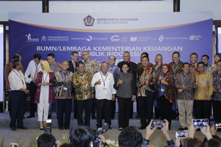 Wali Kota Semarang Hendrar Prihadi beserta Menteri Keuangan, Menteri PUPR, Menteri Kominfo berfoto bersama usai penandatanganan HOA KPBU SPAM Semarang Barat di Hotel Melia Nusa Dua Bali, Senin (8/10/2018).