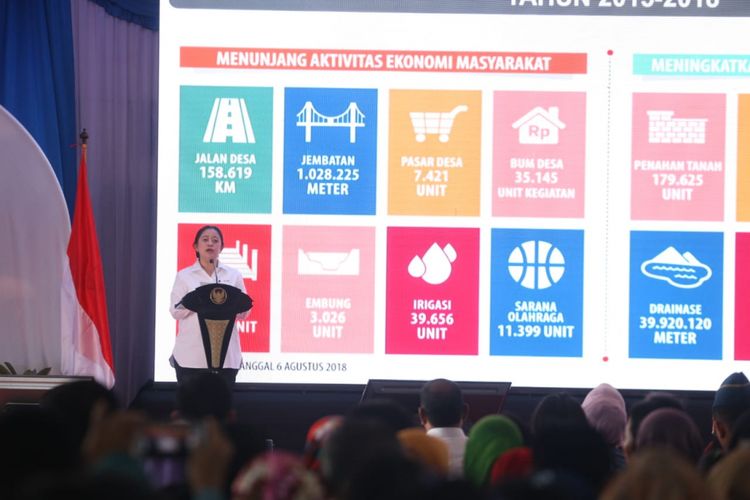 Menko PMK Puan Maharani menjelaskan capaian penggunaan dana desa dalam rapat koordinasi pengendalian program pembangunan dan pemberdayaan masyarakat desa di aula pertemuan Kantor Bupati Deli Serdang, Medan, Senin (9/10/2018).