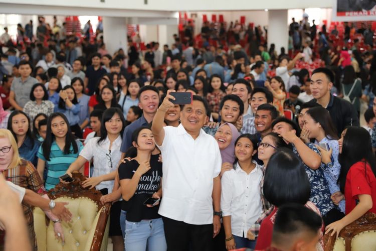 Usai talkshow Membumikan Pancasila Di Era Milenial, Gubernur Olly mengajak wefie para mahasiswa Universitas Sam Ratulangi, Rabu (24/10/2018).