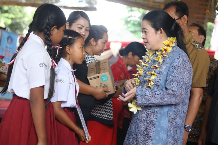 Menteri Koordinator Bidang Pembangunan Manusia dan Kebudayaan (Menko PMK) Puan Maharani saat memberikan bantuan kepada warga Desa Penarungan dalam kunjungan kerjanya ke Kabupaten Badung, Bali, Selasa (6/11/2018)(Dok. Humas Kementerian Koordinator Bidang Pembangunan Manusia dan Kebudayaan (Kemenko PMK))