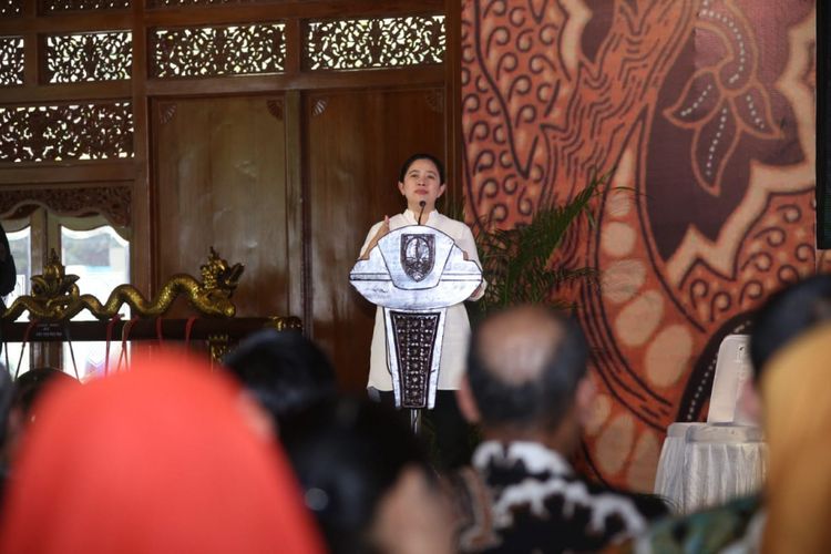 Menko PMK Puan Maharani saat memberikan sambutan kepada para penerima bantuan pemerintah di Pendapi Agung Kota Surakarta, Surakarta, Jumat (9/11/2018).