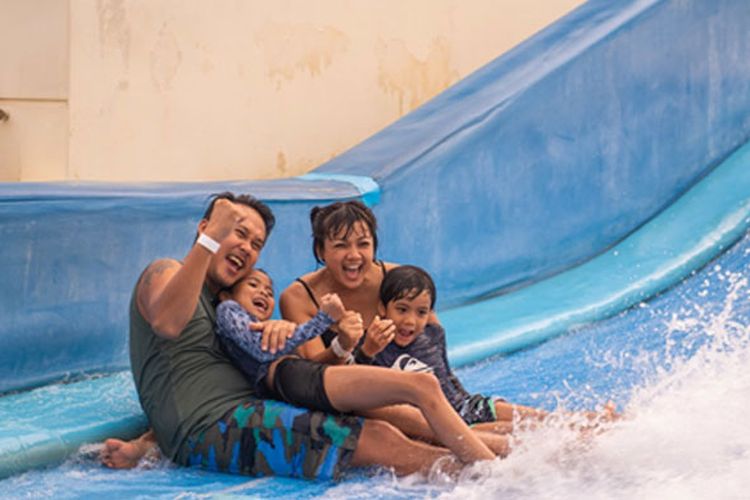 Nirina bersama keluarganya saat mencoba wahana di Wave House, Pulau Sentosa, Singapura.