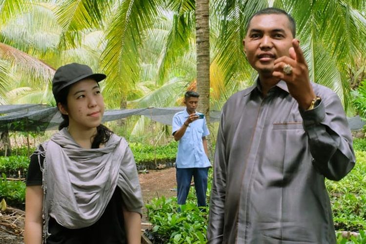 Barista Indonesia bersertifikat internasional Evani Jesslyn saat berbincang bersama Al Hakim yang menjabat sebagai Ketua Indikasi Geografis (IG) Kopi Liberika Rangsang Meranti.