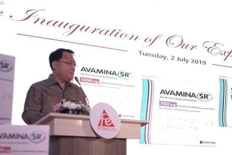 Direktur Utama PT Ferron Par Pharmaceuticals Krestijanto Pandji saat memberikan sambutan dalam acara pelepasan ekspor perdana produk Avamina SR®.