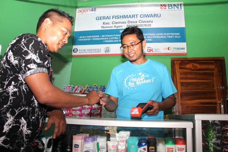 Seorang warga sedang bertransaksi di Agen46 yang juga merupakan Gerai Fish Mart di di Desa Ciwaru, Kecamatan Ciemas, Kabupaten Sukabumi, Jawa Barat, Sabtu (20 Juli 2019). Selain meningkatkan literasi keuangan dan memberikan bantuan CSR berupa mobil ambulans dan Kapal Latih Nelayan berukuran 5 GT di daerah tersebut, BNI juga menyalurkan Kredit Usaha Rakyat (KUR) kepada nelayan yang secara total telah disalurkan sebesar Rp 9,37 triliun kepada 109.020 penerima per 30 Juni 2019.()