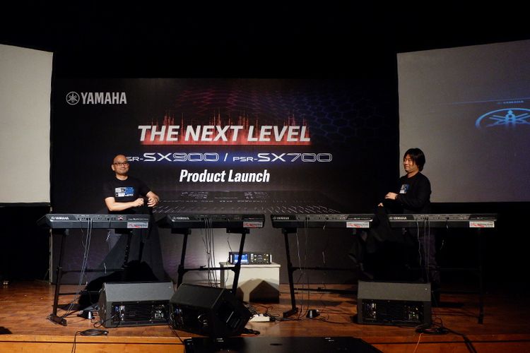 Presiden Direktur YMID Shinichi Takenaga dan GM Marketing Division YMID Shogo Ito saat mengungkap keyboard terbaru Yamaha pada acara peluncurannya.