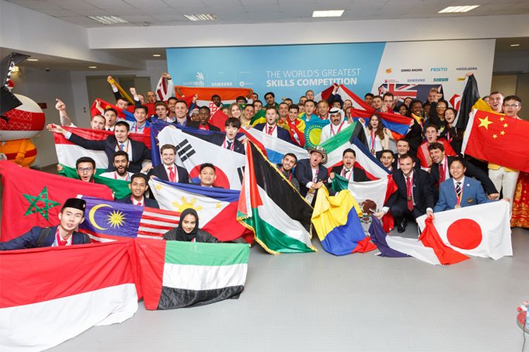 Para pelajar yang menjadi perwakilan negaranya masing-masing berfoto bersama pada ajang WSC 2019 yang diselenggarakan di Kazan, Rusia. (Dok. Kemendikbud)