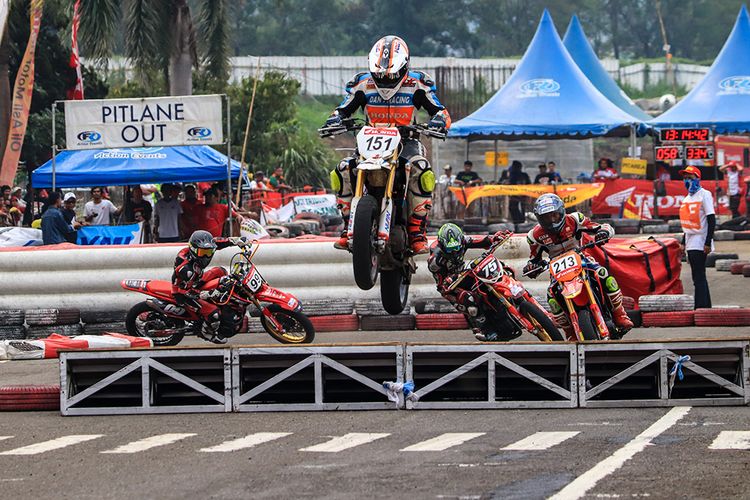Suasana persaingan di kelas balap Honda CRF 150L Supermoto Standar Open pada gelaran Honda Dream Cup 2019, Cimahi, Jawa Barat, Minggu (24/11/2019).