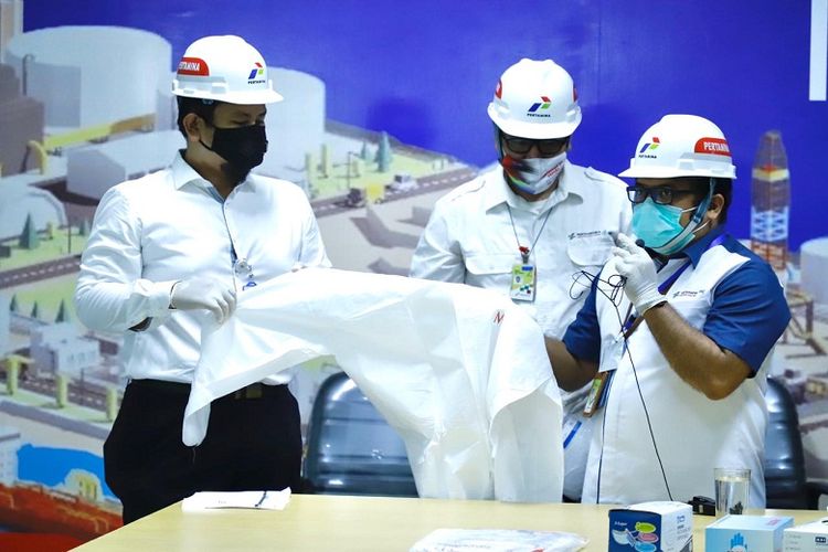 Tim Pertamina memperlihatkan Alat Pelindung Diri yang akan di salurkan (DOK. Pertamina)